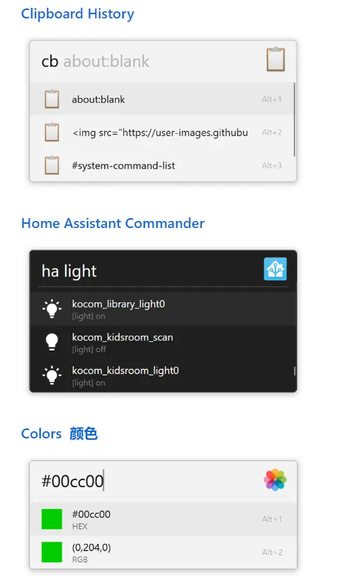 丰富的插件支持:支持广泛的插件,如Spotify Premium、Steam搜索、剪贴板历史记录等。